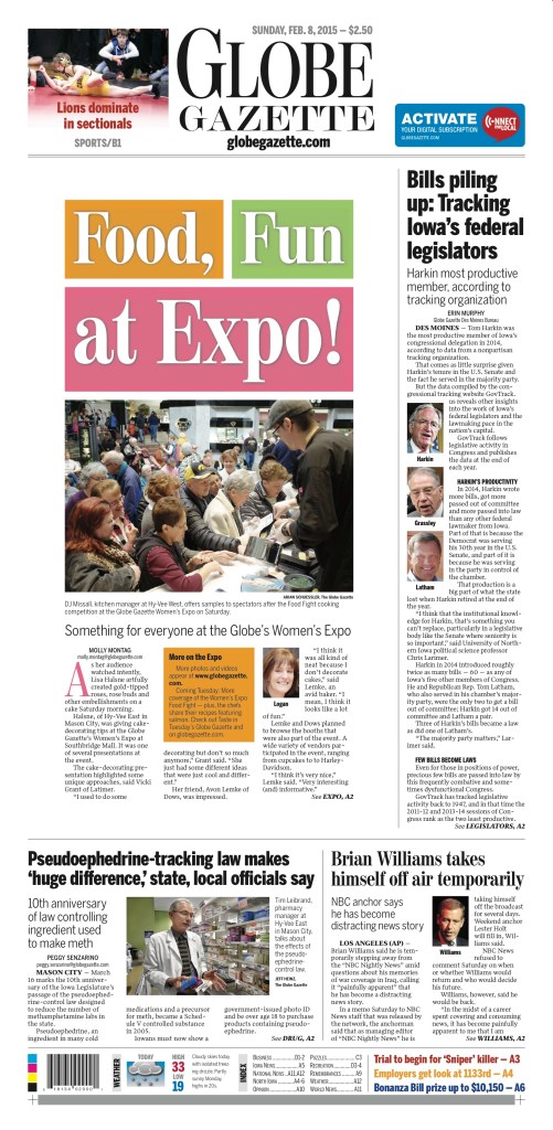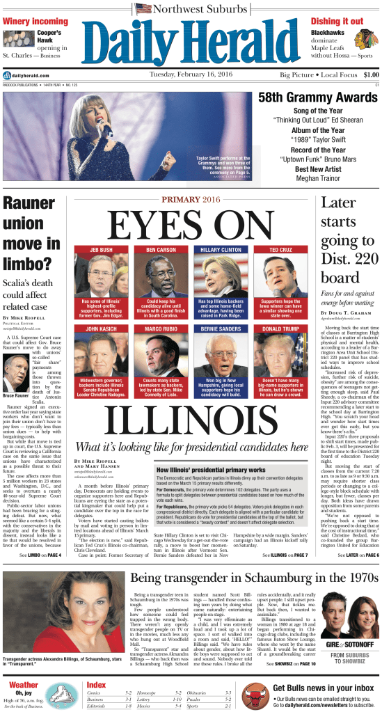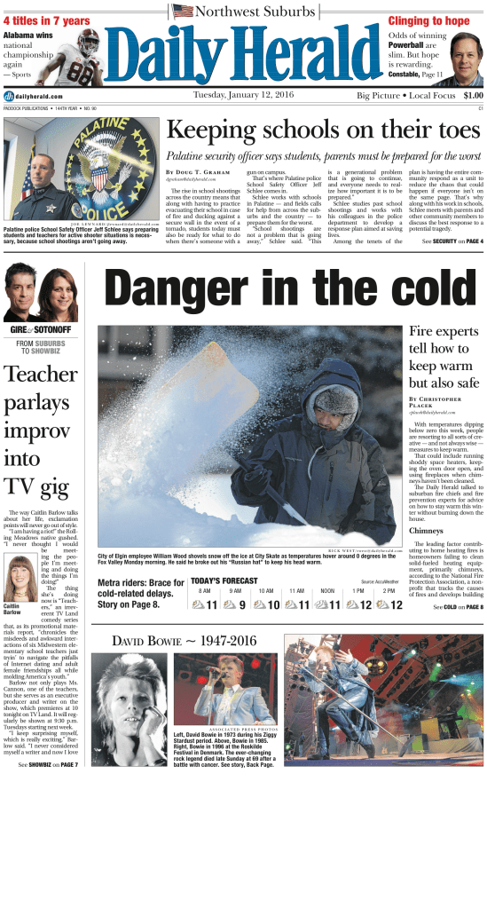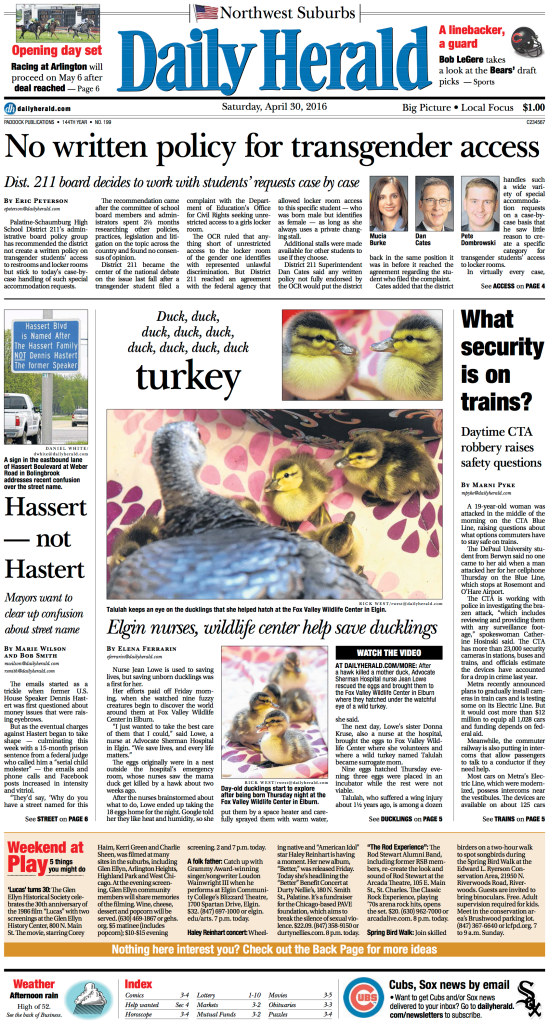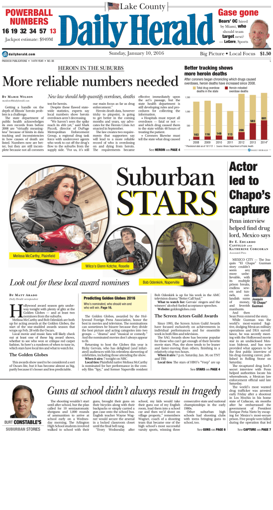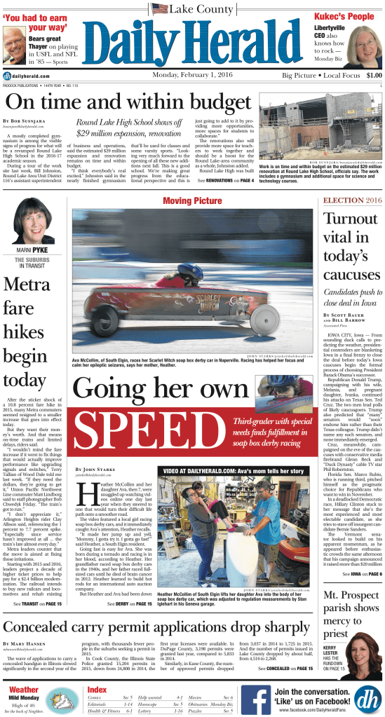 Designed for the Daily Herald (Arlington Heights, Illinois), the Rapid City Journal (Rapid City, South Dakota), The Southern (Carbondale, Illinois), the Globe Gazette (Mason City, Iowa), and the Daily Eastern News (Charleston, Illinois). 2011-2017.