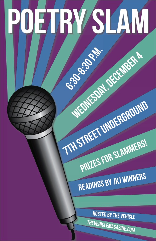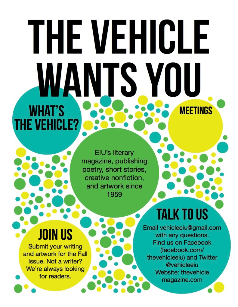 Posters for pop punk band Blu Carpet Authority (2024) and The Vehicle, Eastern’s student-run literary magazine (2013).